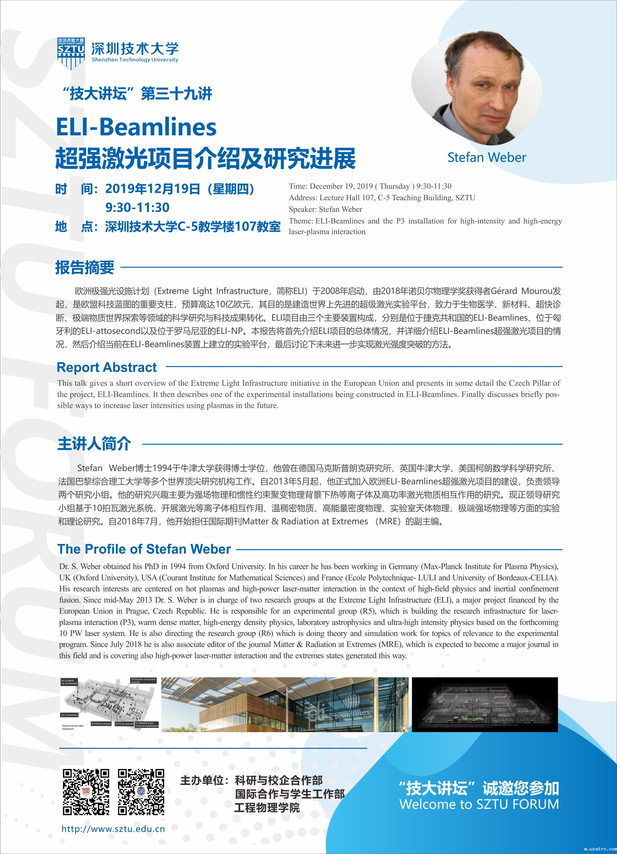 Stefan Weber博士1994于牛津大学获得博士学位,他曾在德国马克斯普朗克研究所、英国牛津大学、美国柯朗数学科学研究所、法国巴黎综合理工大学等多个世界顶尖研究机构工作。自2013年5月起,他正式加入欧洲ELI-Beamlines超强激光项目的建设,负责领导两个研究小组。他的研究兴趣主要为强场物理和惯性约束聚变物理背景下热等离子体及高功率激光物质相互作用的研究。现正领导研究小组基于10拍瓦激光系统,开展激光等离子体相互作用、温稠密物质、高能量密度物理、实验室天体物理、极端强场物理等方面的实验和理论研究。自2018年7月,他开始担任国际期刊Matter & Radiation at Extremes(MRE)的副主编。