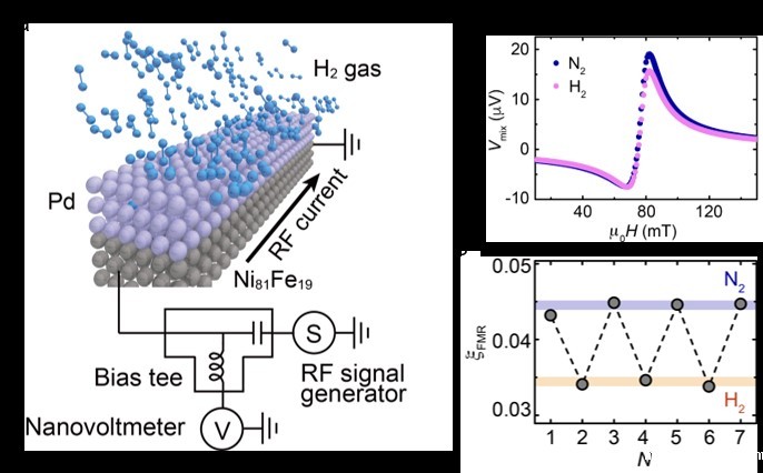 该论文通过制备钯/铁磁体异质结电子器件,采用铁磁共振检测方法,首次揭示了钯吸氢对器件中自旋矩产生效率的影响(如图1所示)。研究发现,当在放置异质结器件的密闭容器内交替通入氢气和氩气时,自旋矩效率有很大变化,并且变化率保持稳定。