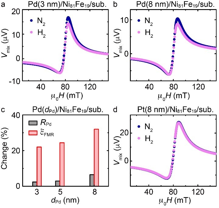 图2: a和b.改变钯金属薄膜厚度时铁磁共振曲线变化;c.吸收氢气时自旋矩效率变化和电阻变化的对比;d.用铂替换钯时,曲线无变化。