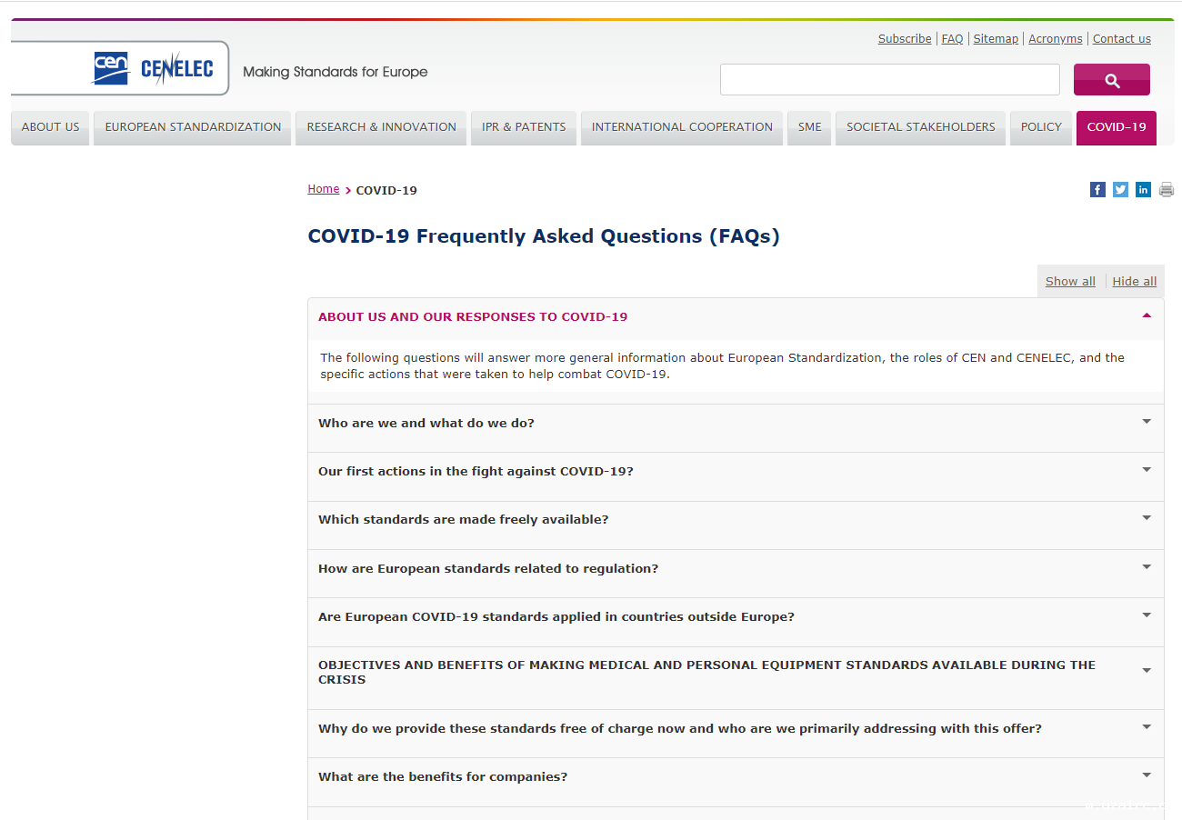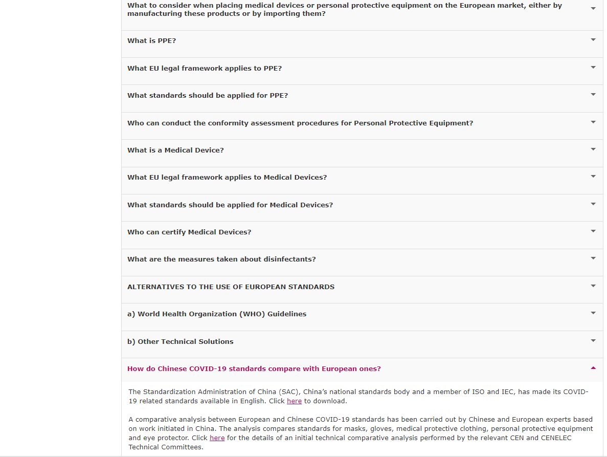 目前,这6份报告已被欧洲最主要的标准化机构——欧洲标准化委员会-欧洲电工标准化委员会(CEN-CENELEC)采用并发布在其官网“疫情常见问答”栏目。网址为:https://www.cencenelec.eu/covid19/Pages/COVID19_FAQs.aspx。