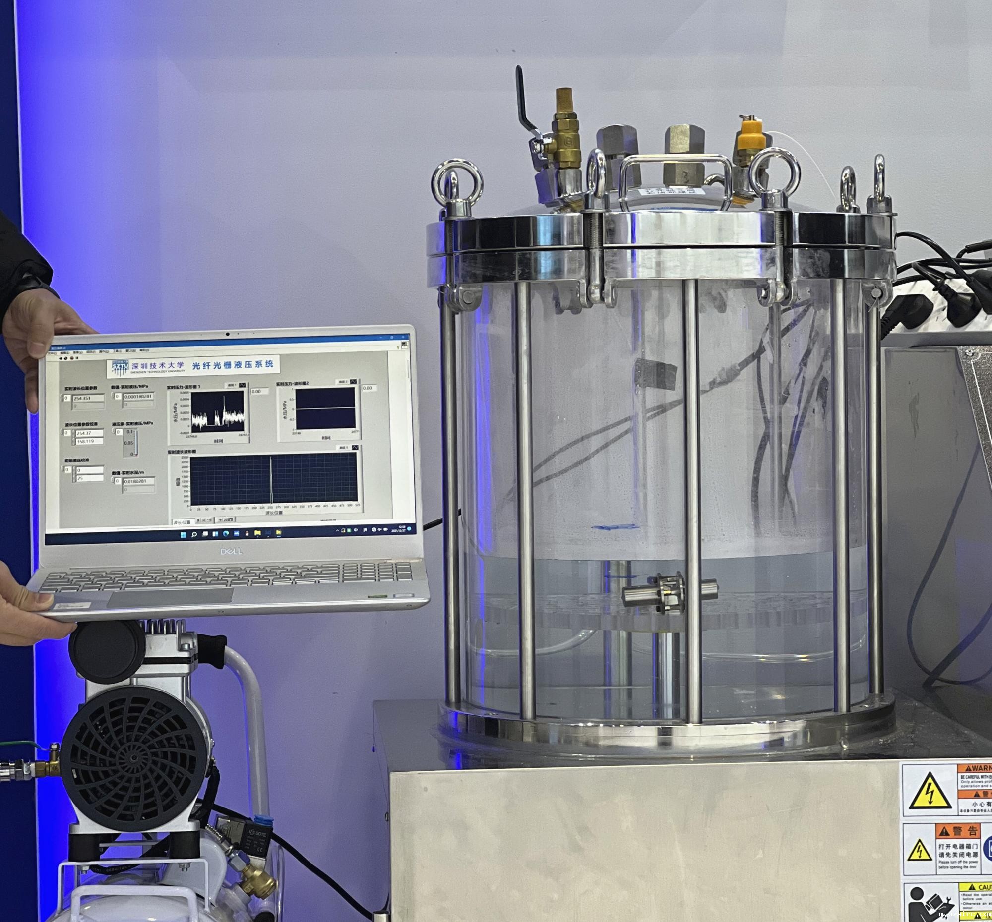 本装置采用布拉格光纤光栅(FBG)为基底,设计了一套准分布式光纤压力传感器。该传感器主要由宽带光源、环形器、多个传感探头、光谱仪、数据处理系统以及显示器所组成。而传感探头是由合金钢制作的法兰圆筒聚合物、FBG光纤、双头螺杆及螺母所组成。该装置的传感与传输均以光为载体,具有工艺简单、灵敏度高、性能稳定等优点。