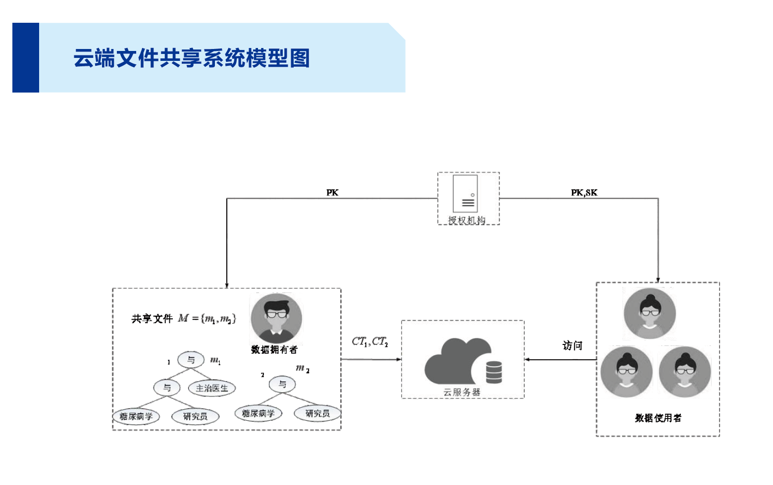 云数据的使用与共享给人们的生活和工作带来便利的同时,也带来了前所未有的数据安全风险。为解决云数据的安全共享问题,避免隐私数据被窃取,该项目提供了一种云端文件共享方法、装置、设备及存储介质。当接收到文件共享请求时,数据拥有者根据内容密钥集合,使用对称加密算法对共享文件集合进行加密;得到文件密文集合,根据公共参数和LSSS访问控制策略,使用加密计算函数对内容密钥集合进行加密;得到与内容密钥集合对应的密钥密文集合,将文件密文集合和密钥密文集合上传至云服务器,实现云端文件共享,从而通过该发明的LSSS访问控制策略满足了“与”门、“或”门和“门限”的访问树结构,实现了灵活的细粒度访问控制,降低了密文的存储开销、通信开销以及解密的计算复杂度,提高了加密效率、解密效率以及共享数据的安全程度。