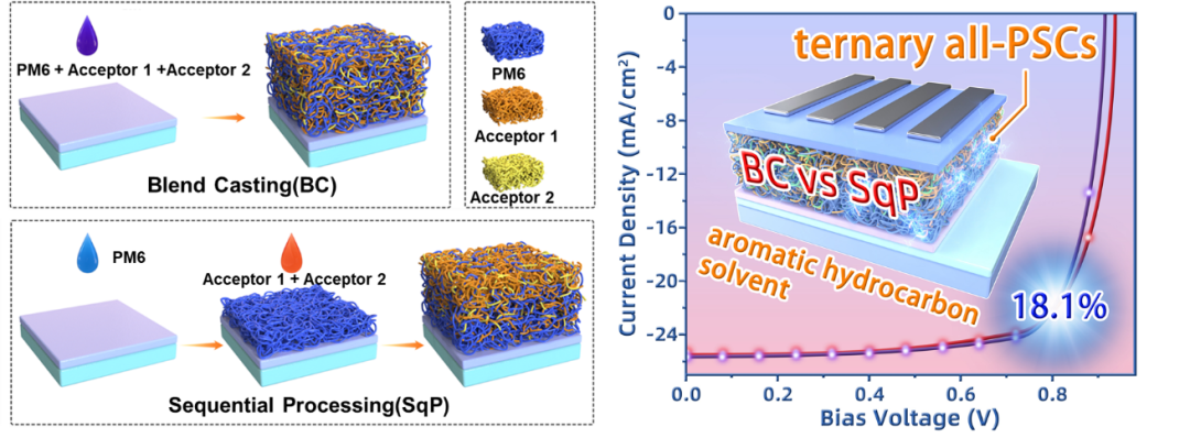 近日,我校新材料与新能源学院助理教授张光烨带领团队成员使用了逐层制备的加工技术在非卤素溶剂中实现了18.1%的光电转化效率,同时解决了电子迁移率低和低沸点卤素溶剂制备的问题,而且还提高了器件的机械性能和光稳定性。迄今为止,这也是非卤素全聚合物太阳能电池领域的最高效率。团队通过in-situ UV、FLAS、2D-GIWAXS、瞬态光电流光电压和电压损耗测试等光电物理测试深入探讨三元SqP的非卤素的全聚合物太阳能电池的性能提升机理,该方法为三元太阳能电池的优化提供了新思路。