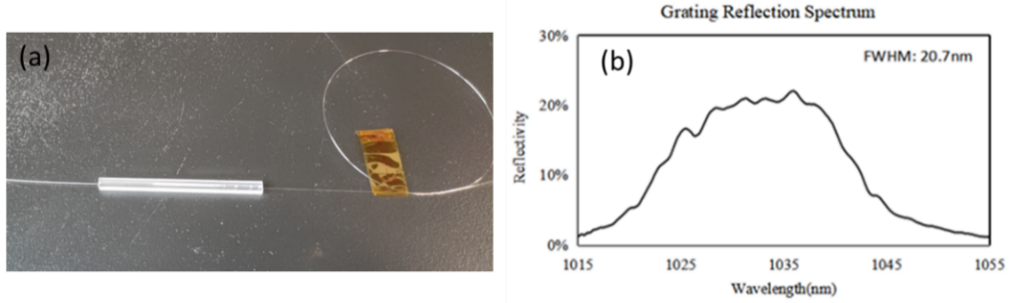基于自制光栅刻写系统,制作了CFBG样品,图2(a)是CFBG样品照片,图2(b)是CFBG样品的反射光谱,该样品中心波长1032.5 nm,光谱带宽为20.7 nm(半高全宽),光谱调制原因为测试所用的ASE光源光谱波形陡峭导致测量误差。