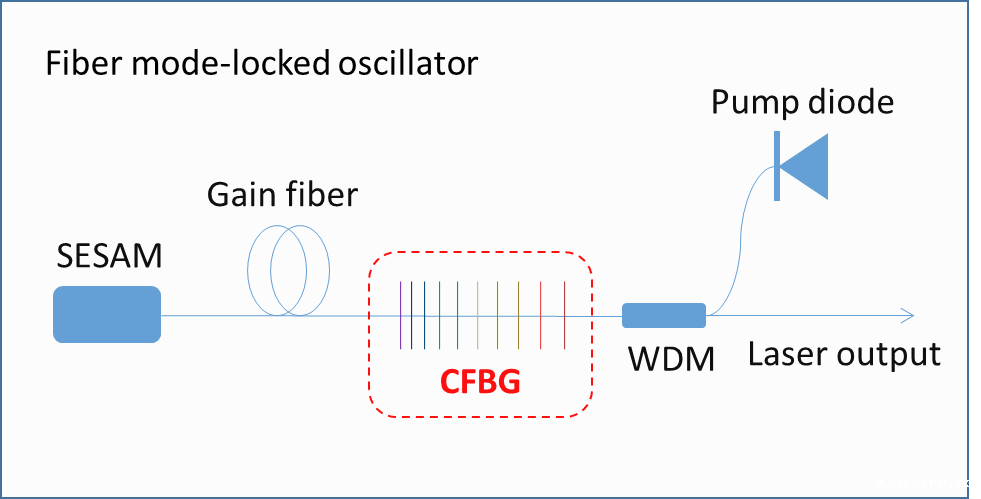 飞秒激光在3C产业、增材制造、精准医疗、微纳加工、超快检测等领域拥有广阔应用前景,光纤锁模技术逐渐成为产生飞秒激光的主流方法。图1显示了光纤锁模振荡器光路图,其中啁啾布拉格光栅(Chirped Fiber Bragg Grating, CFBG),或称之为色散管理反射器(Dispersion Management Reflector, DMR)用于补偿腔内色散,是必不可少的关键器件。然而CFBG/DMR提供的色散量较小,导致制作工艺复杂,截止今日该器件主要依赖进口,这使得我国飞秒激光产业面临不可控风险,不利于飞秒激光的推广应用。