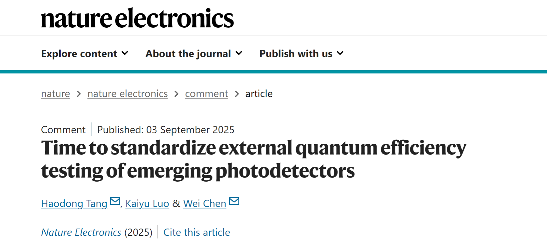 近日,我校集成电路与光电芯片学院青年教师唐浩东助理教授和工程物理学院陈威副教授团队在国际知名期刊Nature Electronics发表题为《Time to standardize external quantum efficiency testing of emerging photodetectors》的评论文章(Comment),针对新型光电探测器领域中广泛存在的测试标准不统一问题,提出了改进建议和标准化方向。这是我校青年教师首次在该期刊以第一作者和通讯作者身份发表评论性论文。