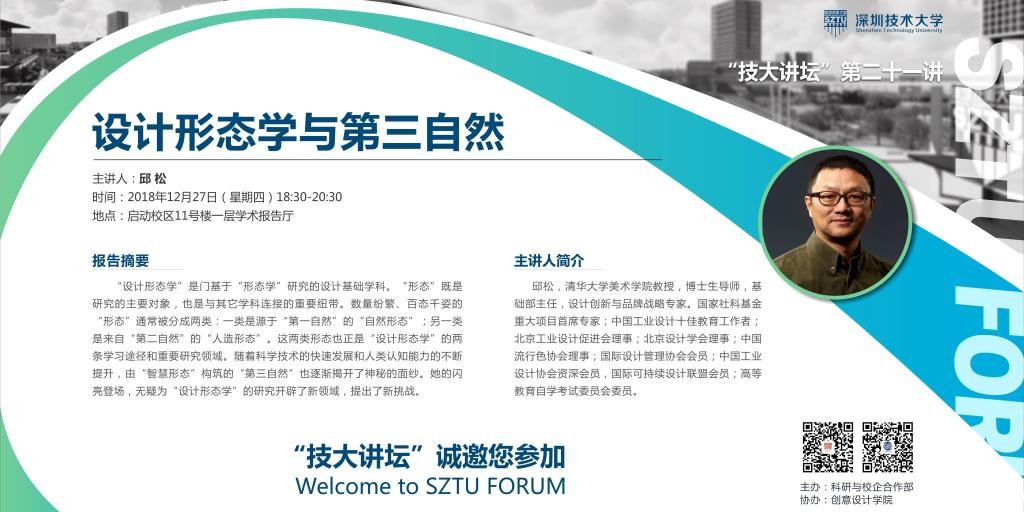 时间:2018年12月27日(星期四)18:30-20:30地点:启动校区11号楼一层学术报告厅主讲人:邱松主题:设计形态学与第三自然讲座摘...