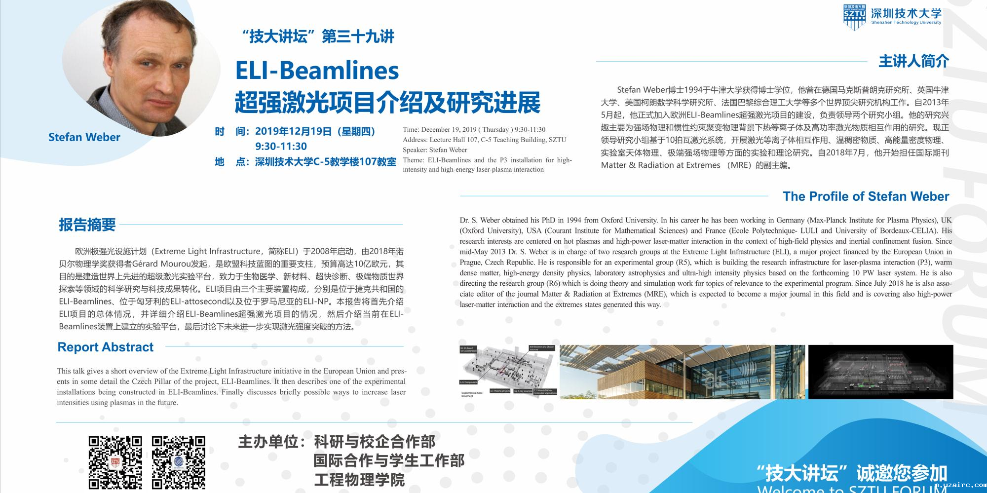 时 间:2019年12月19日(星期四)9:30-11:30地 点:伟德网上appC-5教学楼107教室主讲人:Stefan Weber主 题:ELI-Beamlines超强...