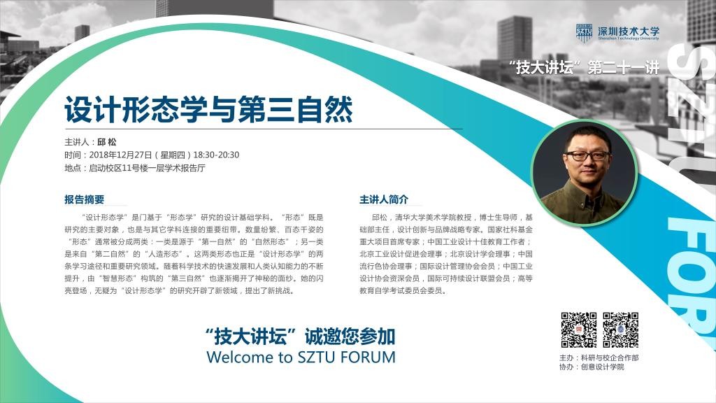 时间:2018年12月27日(星期四)18:30-20:30地点:启动校区11号楼一层学术报告厅主讲人:邱松主题:设计形态学与第三自然讲座摘...
